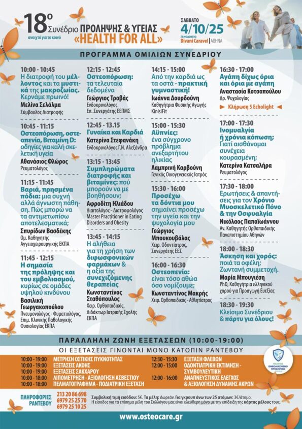 Όπως κάθε χρόνο έτσι και φέτος ο Σύλλογος Πεταλούδα σκοπεύει να γιορτάσει την Παγκόσμια Ημέρα Οστεοπόρωσης υλοποιώντας το 18ο Συνέδριο Πρόληψης «Health for all», το Σάββατο 4 Οκτωβρίου 2025, στο ξενοδοχείο Divani Caravel.