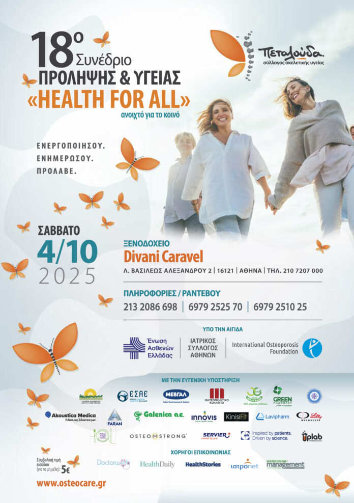 Όπως κάθε χρόνο έτσι και φέτος ο Σύλλογος Πεταλούδα σκοπεύει να γιορτάσει την Παγκόσμια Ημέρα Οστεοπόρωσης υλοποιώντας το 18ο Συνέδριο Πρόληψης «Health for all», το Σάββατο 4 Οκτωβρίου 2025, στο ξενοδοχείο Divani Caravel.